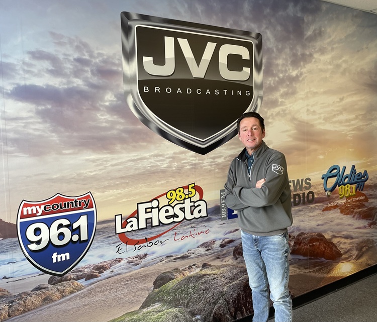 John Caracciolo stands in front of a wall mural with the logos of JVC Broadcasting stations